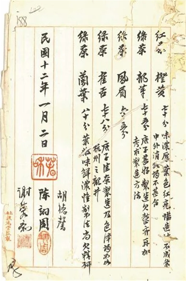 1922年11月,朱文精將實習(xí)所焙制的5種茶樣交實業(yè)司,轉(zhuǎn)送上??偵虝诱垖<以u定。擔(dān)任上??偵虝褂[會茶葉審查員的胡德馨、陳翊周、謝蓉齋3位茶業(yè)專家在詳細(xì)查驗品評茶樣后,聯(lián)合出具了報告書。報告書記載,5份茶樣,合紅茶1份,綠茶4份,分別是橙黃、龍華、鳳眉、雀舌、蘭葉。其中蘭葉“葉嫩味鮮濃”得分最高,獲得80分??傮w來看,專家們認(rèn)為茶業(yè)實習(xí)所送評的茶葉,無論紅茶還是綠茶,茶葉的底子都好,但制法上尚欠精研,還需提高。