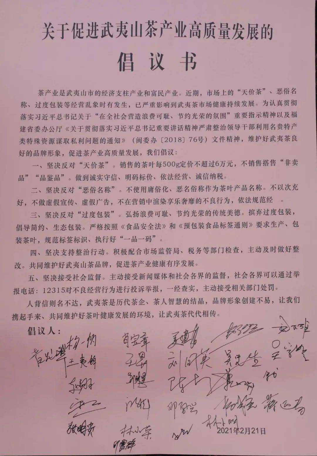 2月21日下午,武夷山市召開促進(jìn)茶葉市場(chǎng)健康發(fā)展推進(jìn)會(huì),26家曾出現(xiàn)在網(wǎng)傳“天價(jià)茶”榜單上的武夷山茶企負(fù)責(zé)人共同簽署《關(guān)于促進(jìn)武夷山茶產(chǎn)業(yè)高質(zhì)量發(fā)展的倡議書》,堅(jiān)決反對(duì)“天價(jià)茶”,堅(jiān)決反對(duì)“惡俗名稱”、“過度包裝”,承諾不做虛假宣傳,規(guī)范經(jīng)營(yíng)管理,不銷售“非賣品”“品鑒品”,自覺接受監(jiān)督,如有違法違規(guī)行為,一經(jīng)查實(shí),主動(dòng)接受相關(guān)部門處罰。