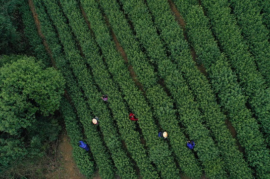 3月20日,采茶工在余杭區(qū)余杭街道竹園村的茶園采摘茶葉(無(wú)人機(jī)照片)。