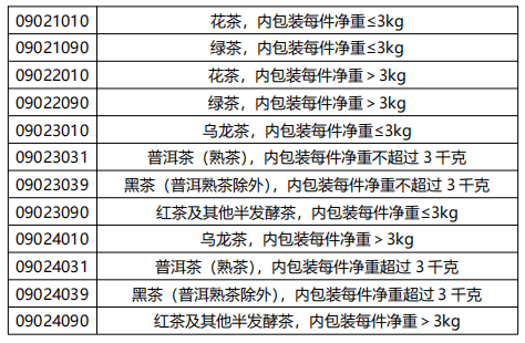 2020年12月,國務(wù)院關(guān)稅稅則委員會對茶葉類進出口稅號進行了調(diào)整,新增黑茶出口稅號類目,調(diào)整后茶葉進出口商品編碼及商品名稱信息如下:
