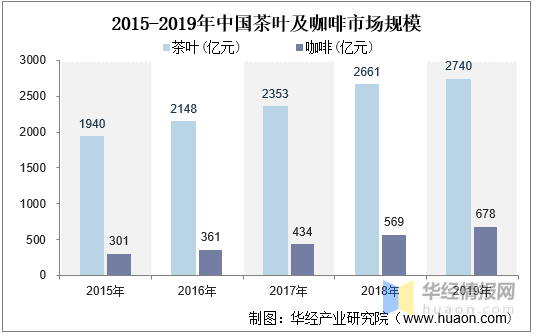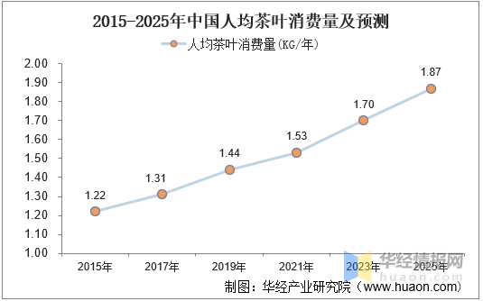 茶始終是中國消費者現(xiàn)制飲料消費的最大品類,茶葉消費市場規(guī)模依然遠高于近年來在中國快速增長的咖啡市場:2019年中國茶葉銷售額達2740億元,遠高于咖啡678億元的市場規(guī)模。從人均茶葉消費量來看,2015-2019年人均消費量持續(xù)增長,由1.22千克/年增長至1.44千克/年,預(yù)計未來將維持增長態(tài)勢,2025年可達到1.87千克/年。