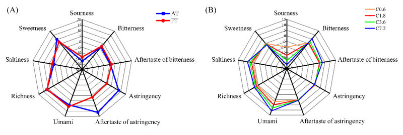 兒茶素,尤其是表沒食子兒茶素沒食子酸酯(EGCG)和表兒茶素沒食子酸酯(ECG)是茶葉苦澀味的最主要來源。秋茶經(jīng)冠突散囊菌PW-1發(fā)酵后,兒茶素總量從118.35 mg/g下降到10.58 mg/g,下降幅度達(dá) 91.06%;且發(fā)酵秋茶中酯化兒茶素EGCG和ECG的含量分別為0.37 mg/g和0.40 mg/g,表明菌株P(guān)W-1發(fā)酵可顯著降低秋茶中的兒茶素含量。通過電子舌技術(shù)對秋茶和冠突散囊菌PW-1發(fā)酵秋茶的滋味特征進(jìn)行分析,發(fā)現(xiàn)秋茶的澀味顯著降低而鮮味強(qiáng)度有所增加,表明秋茶經(jīng)菌株P(guān)W-1發(fā)酵后的滋味品質(zhì)得到顯著提高。此外,通過電子舌技術(shù)首次對茶褐素的滋味特征進(jìn)行分析,發(fā)現(xiàn)茶褐素?zé)o澀味而呈強(qiáng)烈的鮮味,為發(fā)酵秋茶中的主要呈味物質(zhì)。