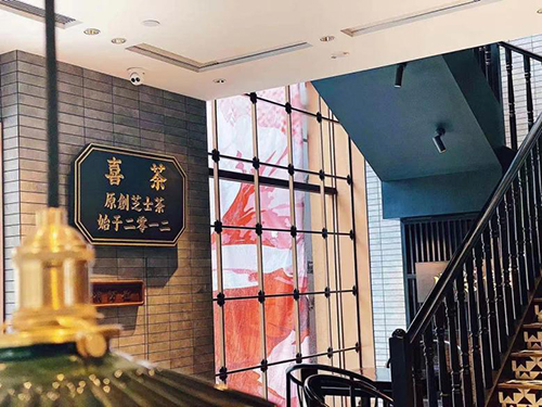 喜茶起源于江門,成長于廣東。將新茶風帶給世界的同時,喜茶仍在回頭凝視自身中流淌的廣府文化基因。喜茶整合永慶坊傳統(tǒng)建筑與廣東茶文化特點,讓新與舊達到平衡,使店面擁有現(xiàn)代藝術也有傳統(tǒng)老廣氣息,并將老廣州元素融入空間:三雕一彩一繡,青石磚,銅板浮雕,滿洲窗、趟櫳門、騎樓街,讓嶺南文化在新式茶文化中靈動延續(xù)。