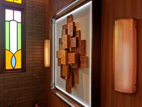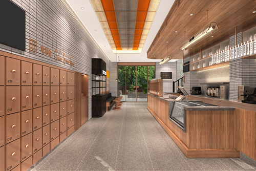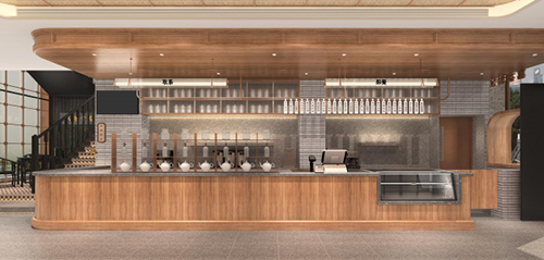 水吧區(qū)域的木紋理與天然石材構造傳統(tǒng)茶樓氛圍,以新延舊的方式來設計水吧區(qū)域。