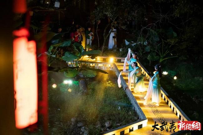 中秋之夜,月滿情濃。武夷山宋街景區(qū)內(nèi),流光溢彩,人流如織。吃茶、聽曲、猜燈謎......伴隨著古街內(nèi)的典雅的古琴聲“宋風當潮 · 武夷月夕”活動擺茶開席,歌舞秀+民俗表演,將歷史上武夷山中秋夜民間祭月的場景予以復(fù)原,讓現(xiàn)場游人穿越時空,感受傳統(tǒng)中秋的賞月民俗。